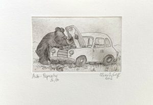 Seine liebevollen, humorvollen Tier-Darstellungen menschlicher Charaktere setzt er mit Hilfe der Radier-Technik um. - 1983 erhielt er den Kunstpreis von Alzey-Worms.